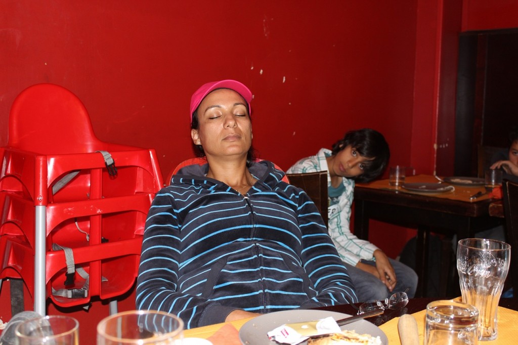 Journée harassante, la fatigue commence à se faire sentir mais la bonne humeur est toujours au rendez-vous. Adultes comme enfants profitent du moindre mur, sol, pause pour se reposer.