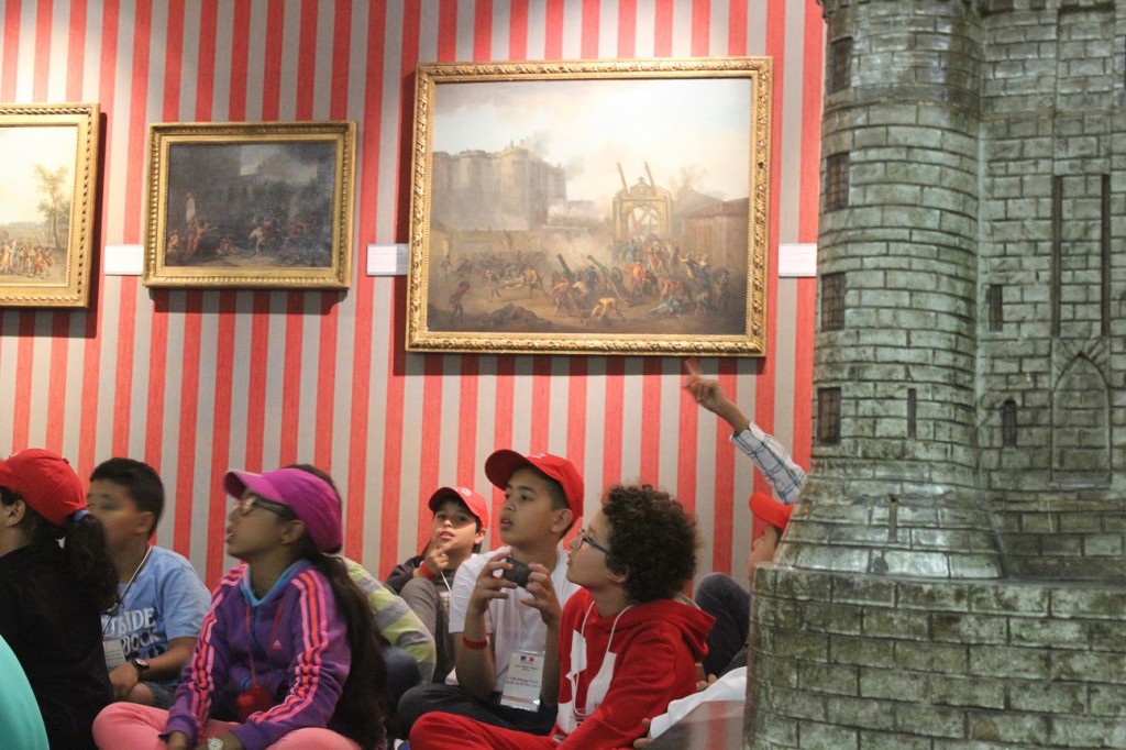Les enfants en prennent pour leur grade. Ils restent "scotchés" devant les tableaux et objets de l'époque: original de la Déclaration des Droits de l'Homme, Le serment du jeu de paume, caricature représentant la noblesse, le clergé et le tiers état, Bastille taillée dans une vrai pierre de la Bastille, cheveux des enfants de Marie Antoinette??!!