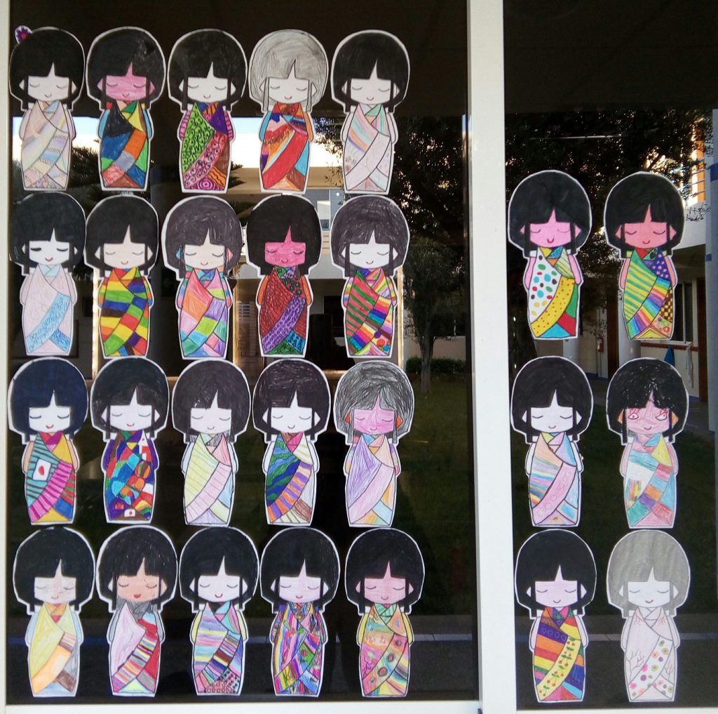 Ils sont heureux de présenter chaque semaine sur les murs et les fenêtres de leur classe le résultat de leurs travaux : voici par exemple les cerisiers japonais, les poissons multicolores, les poupées kokeshi et leurs kimonos bariolés !