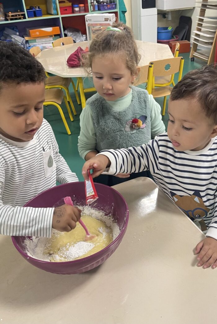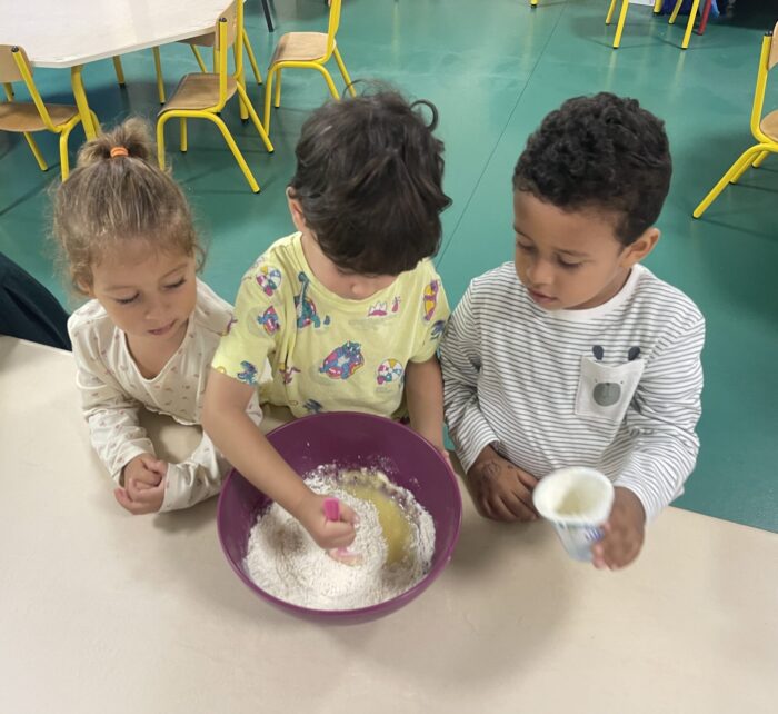 On a cassé les œufs, versé le yaourt et ajouté le sucre, la farine et l’huile. C’était rigolo de tout mélanger avec la cuillère !